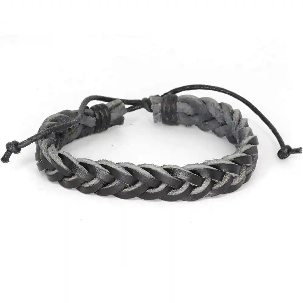 Deze armbandenset voor mannen bestaat uit twee bijpassende armbanden die samen een ruige en stijlvolle uitstraling creëren. De set combineert een gevlochten leren armband in grijs/zwarte afwerking met een parelarmband met matte zwarte parels en details in staal en gouden tinten.