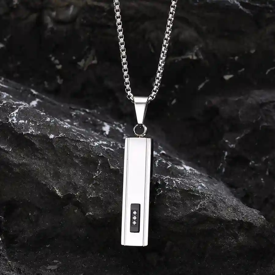 Herensieraad in roestvrij staal met rechthoekige bar hanger en CZ-detailsHerensieraad in roestvrij staal met rechthoekige bar hanger en CZ-detailsHerensieraad in roestvrij staal met rechthoekige bar hanger en CZ-details