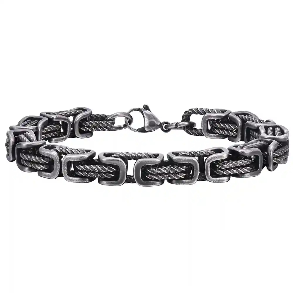 Deze herenarmband van geoxideerd roestvrij staal is ontworpen voor de man die een opvallende look wil zonder concessies te doen aan kwaliteit. De stevige 8 mm ketting combineert gevlochten staalkabels met hoekige schakels, wat de armband een industrieel en mannelijk uiterlijk geeft.