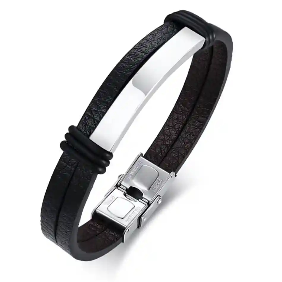 Een tijdloze herenarmband van echt leer en gepolijst roestvrij staal, ontworpen voor de man die eenvoud met stijl waardeert. De armband combineert zwart structuurleer met een elegant staalpaneel, wat een moderne en mannelijke uitstraling geeft. De stevige magneetsluiting maakt het gemakkelijk om om te doen, terwijl het zorgt voor een perfecte pasvorm.