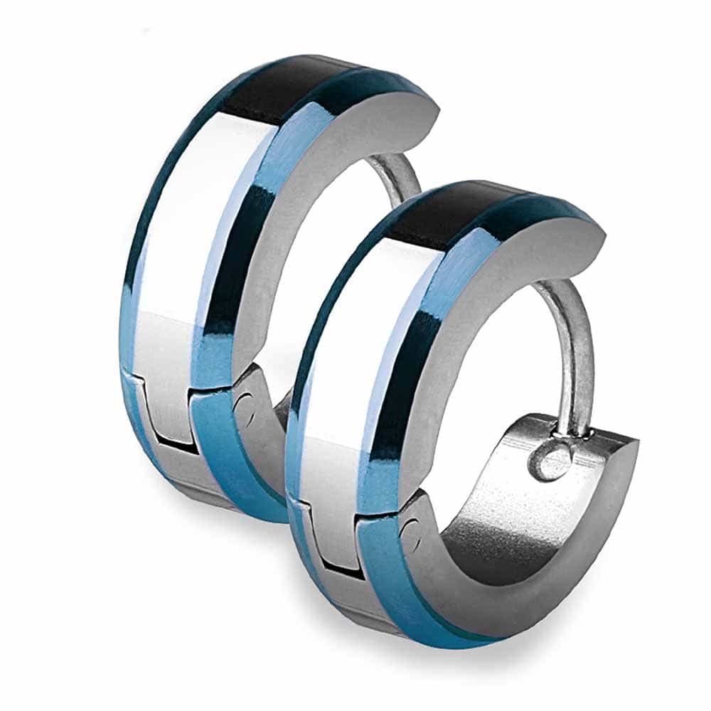 Roestvrijstalen oorbel met blauw gecoate rand.