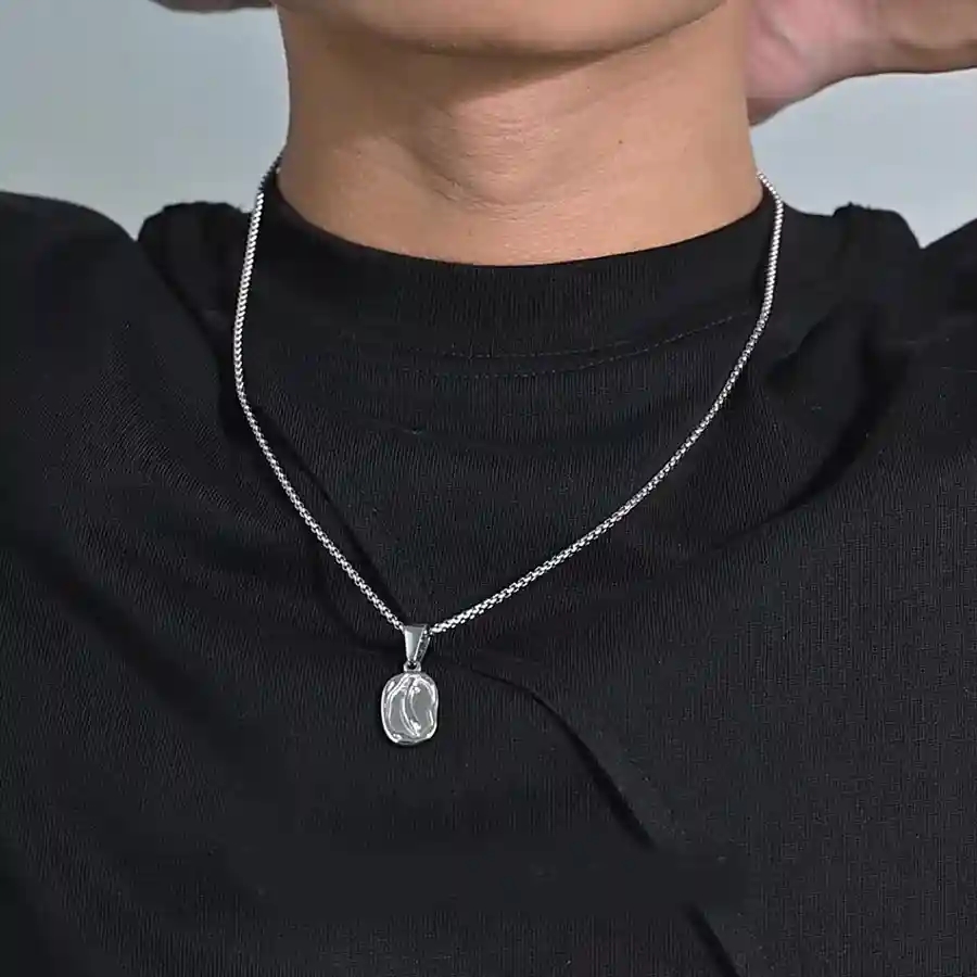 Een stijlvol en uniek ovaal sieraad voor mannen in duurzaam roestvrij staal. Het organische ontwerp meet 2.05 × 1.22 cm, en de slanke ketting wordt geleverd in 60 cm lengte. Met zijn lichtgewicht kwaliteit van slechts 4 g is dit een subtiele statement voor elke man die een modern en tijdloos uiterlijk wenst.