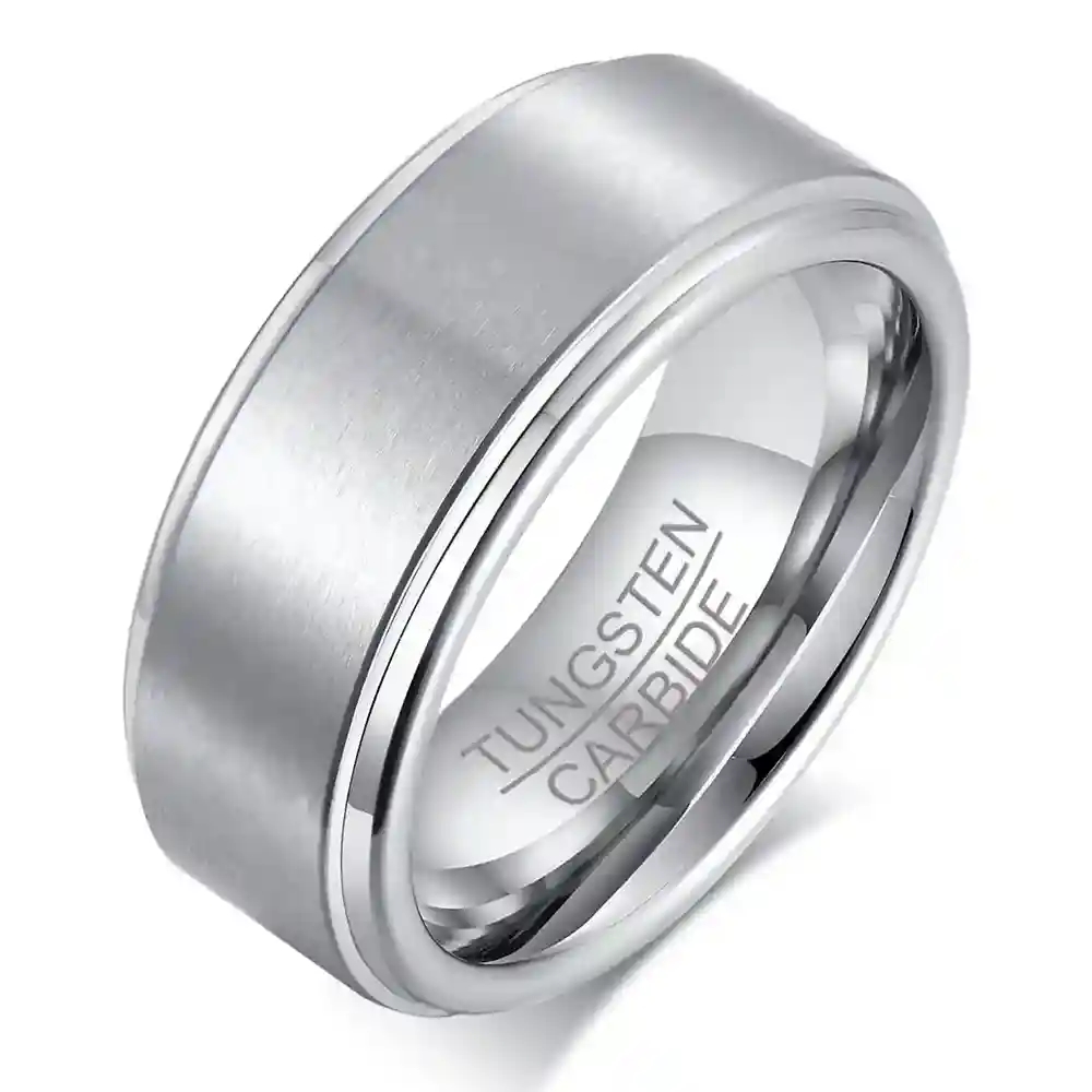 De 8 mm brede ring van massief tungsten heeft een exclusieve, geborstelde afwerking met gepolijste randen, wat een moderne en mannelijke uitstraling geeft.