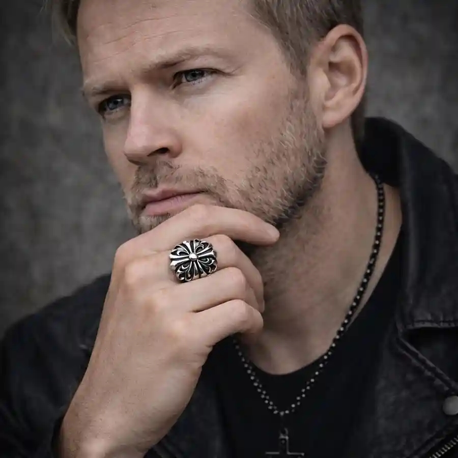 Gemaakt van massief roestvrij staal, biedt deze ring zowel een zwarte als een glanzende afwerking, die zijn robuuste mannelijkheid benadrukt.