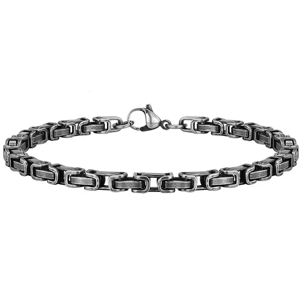 Geef je look een stoer en mannelijk karakter met Titan Link – een herenarmband in geoxideerd roestvrij staal, ontworpen met robuuste vierkante schakels in antieke zilverafwerking. De armband meet 21 cm en heeft een breedte van 4 mm, waardoor hij perfect is voor zowel dagelijks gebruik als meer stijlvolle gelegenheden.